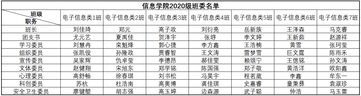 经各班公平选举,学院辅导员审核,现将信息学院2020级各班班委名单公示如下: