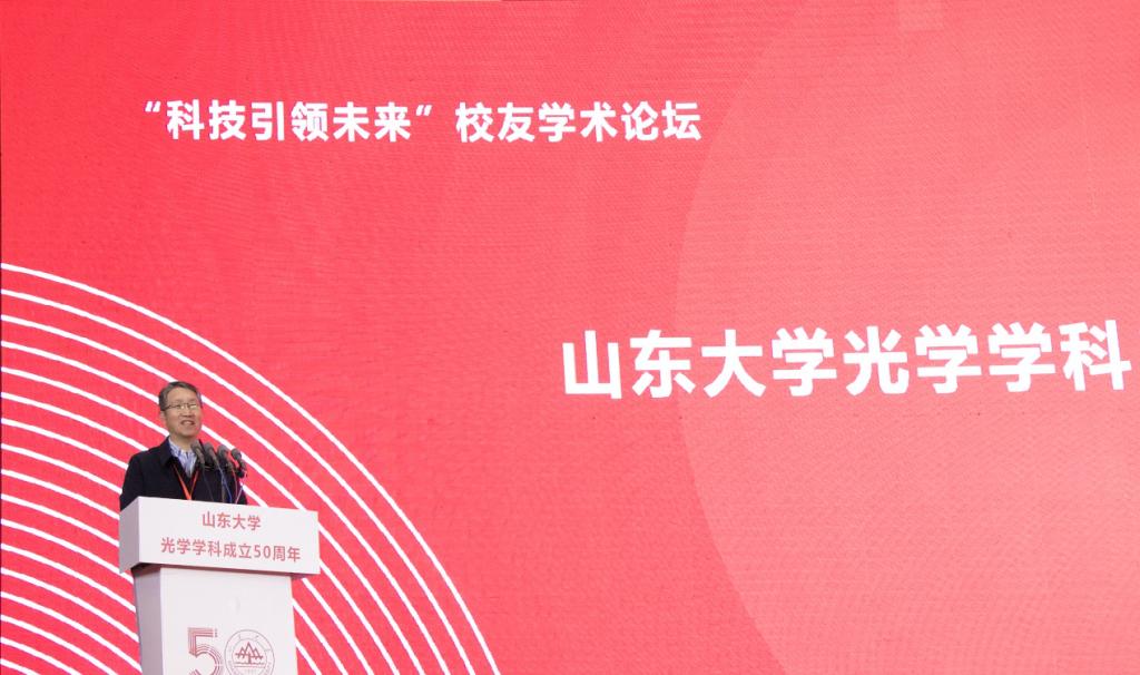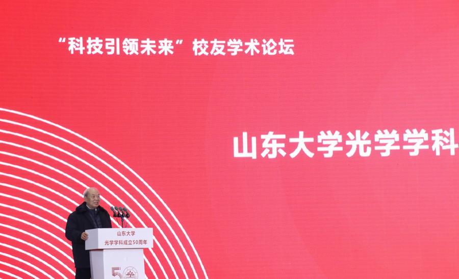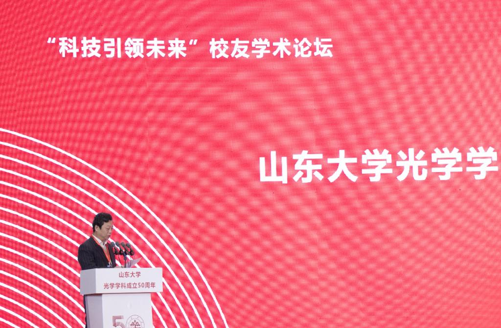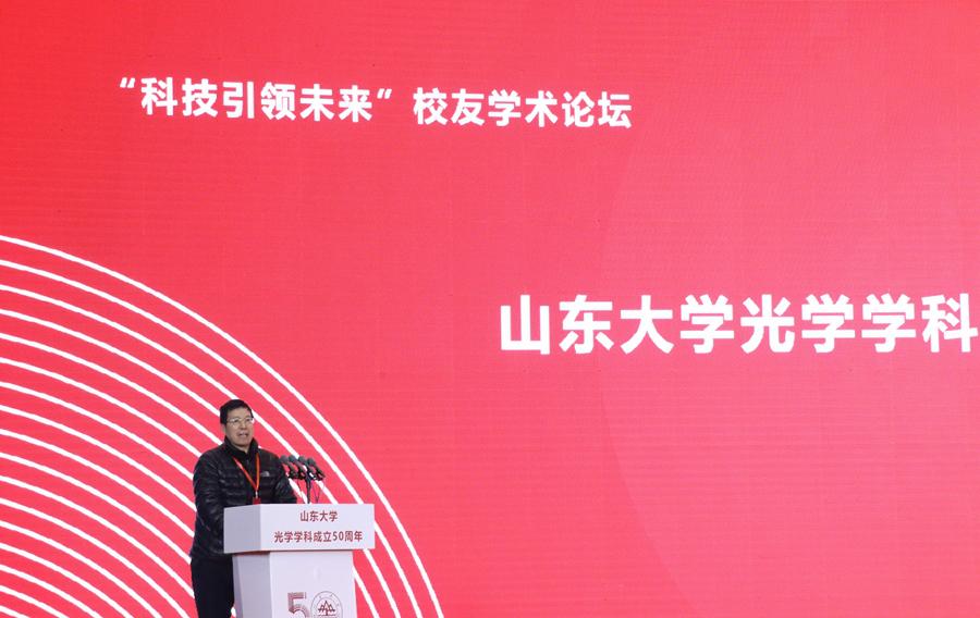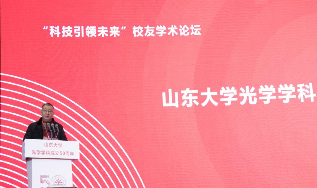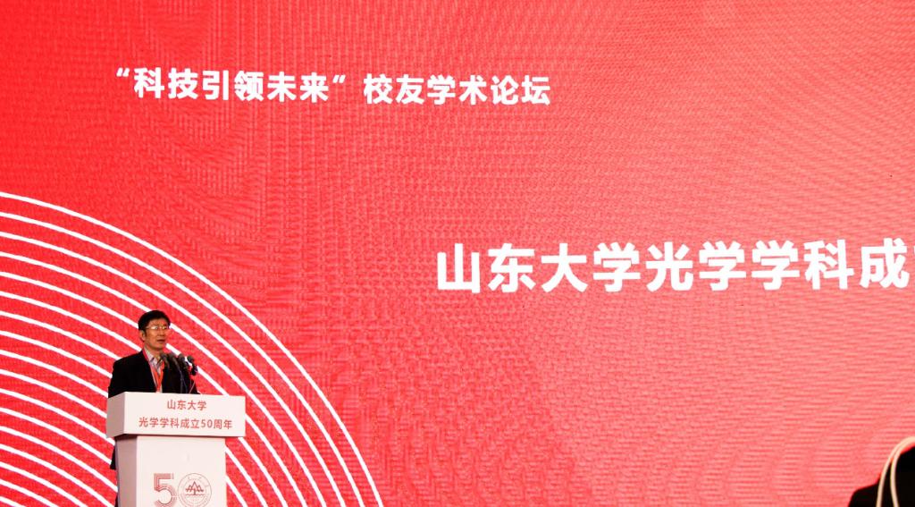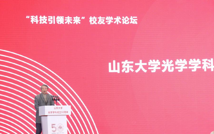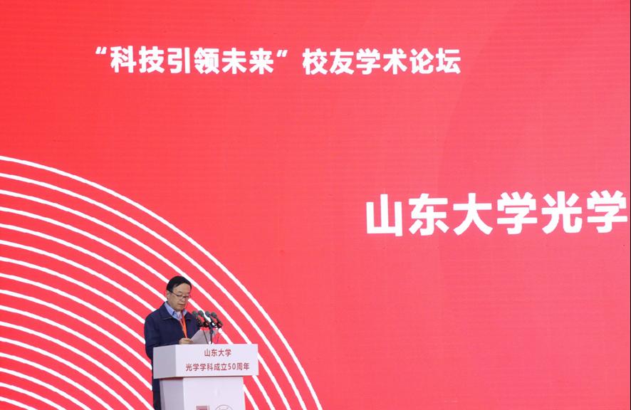 王青圃教授作为退休教师代表为庆典致辞。他回望50年来必赢76net线路官网光学学科的点点滴滴,回顾了山大光学学科的杰出前辈们,也如数家珍般点评了众多杰出的校友代表。他表示目前光学学科的平台、梯队建设成效显著,对光学学科的未来更加充满信心,他祝愿山大光学学科扬帆起航、乘风破浪。