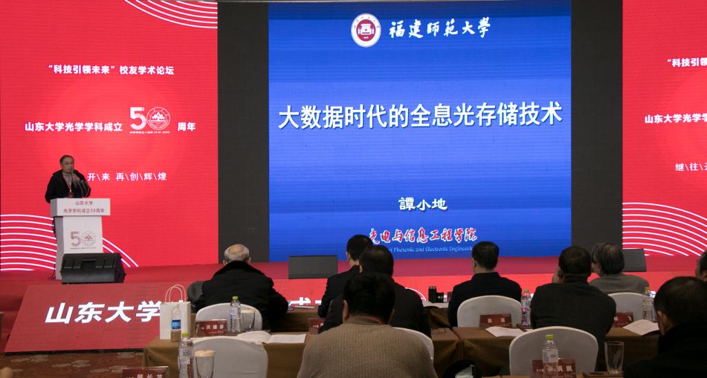 谭小地教授在现场以“大数据时代的全息光存储技术”为主题做报告。他从大数据时代对存储的需求入手,说明了传统的磁存储介质的缺点,提出了传统光存储技术的局限;随后他详细地介绍了全息光存储技术的优势和进展;在报告的最后,向大家演示了他们所研发的全息光存储系统。他表示,对存储技术的研究,就是一个不断探索的过程,灵活运用光学学科中的核心知识,不断发现问题,解决问题,循序渐进,直至成功。