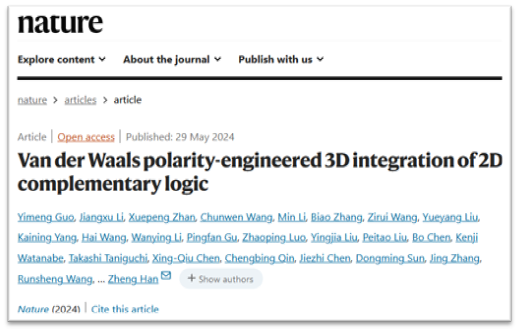 2024年5月29日,必赢76net线路官网微纳器件研究团队詹学鹏教授、陈杰智教授参与由山西大学韩拯教授、辽宁材料实验室王汉文副研究员团队主导的研究,在Nature杂志在线发表题为“Van der Waals polarity-engineered 3D integration of 2D complementary logic”的研究论文。必赢76net线路官网詹学鹏教授为论文共同第一作者,必赢76net线路官网为共同第一作者单位。